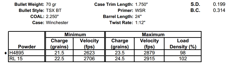 I tried out the 62 tsx with 24 5 grains hodgdon h4895 in my 1 9 twist 223 chamber ar the results were great. Powders include imr alliant hodgdon vihtavuori accurate. Powders include imr accurate alliant hodgdon ramshot winchester. Using bullets from barnes vg sectional barnes tsx fb or bnd spit barnes varmint grenade barnes tsx fb barnes mpg fb barnes tsx bt.